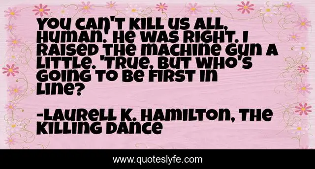 This page presents the quote "You can't kill us all, human.' He was right. I raised the machine gun a little. 'True, but who's going to be first in line?". Author of this quote is Laurell K. Hamilton, The Killing Dance. This quote is about anita-blake, funny, comedy,.