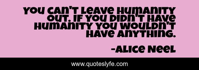 This page presents the quote "You can't leave humanity out. If you didn't have humanity you wouldn't have anything.". Author of this quote is Alice Neel. This quote is about faith, unity,.