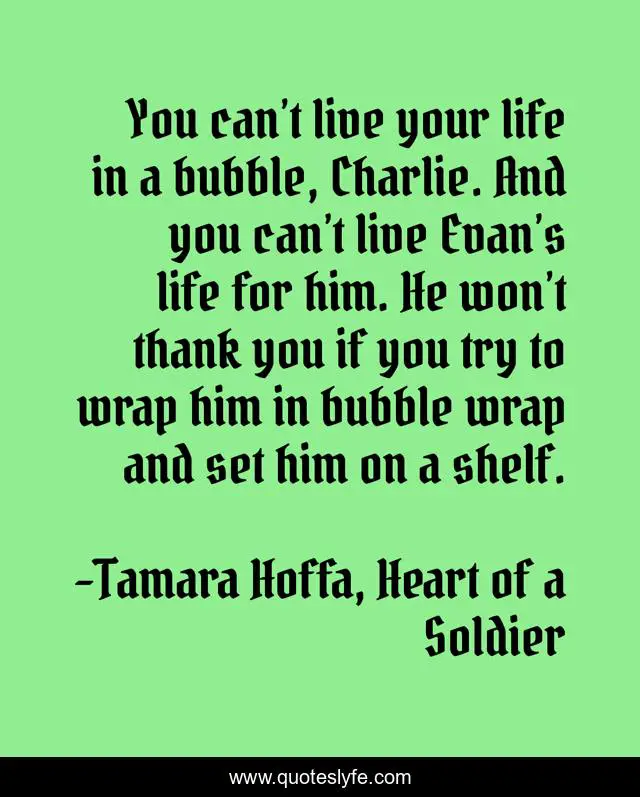 This page presents the quote "You can’t live your life in a bubble, Charlie. And you can’t live Evan’s life for him. He won’t thank you if you try to wrap him in bubble wrap and set him on a shelf.". Author of this quote is Tamara Hoffa, Heart of a Soldier. This quote is about romance, military, widows, second-chance,.