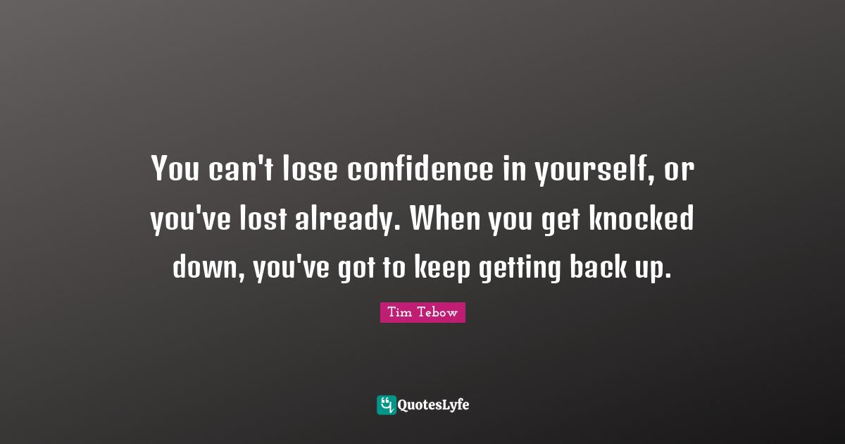 This page presents the quote "You can't lose confidence in yourself, or you've lost already. When you get knocked down, you've got to keep getting back up.". Author of this quote is Tim Tebow. This quote is about lost, knocked down, confidence in yourself, getting back up,.