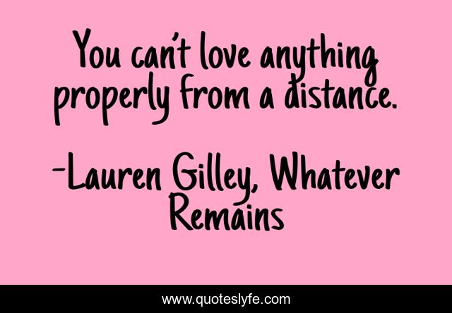 This page presents the quote "You can’t love anything properly from a distance.". Author of this quote is Lauren Gilley, Whatever Remains. This quote is about love, affection, love-hurts,.