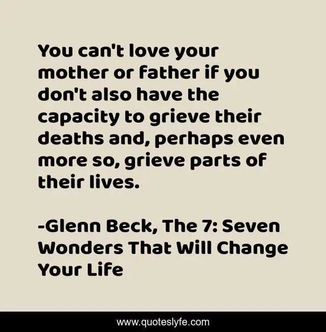 This page presents the quote "You can't love your mother or father if you don't also have the capacity to grieve their deaths and, perhaps even more so, grieve parts of their lives.". Author of this quote is Glenn Beck, The 7: Seven Wonders That Will Change Your Life. This quote is about pain, father, mourning, grief, determination, mother, parents, enlightenment, childhood,.