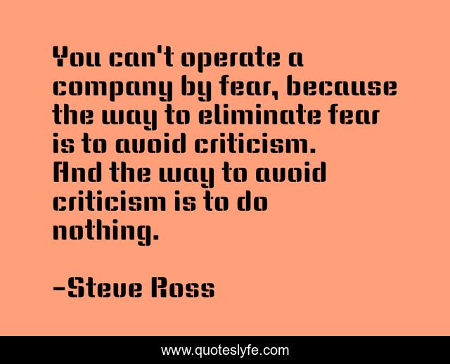This page presents the quote "You can't operate a company by fear, because the way to eliminate fear is to avoid criticism. And the way to avoid criticism is to do nothing.". Author of this quote is Steve Ross. This quote is about fear, company,.