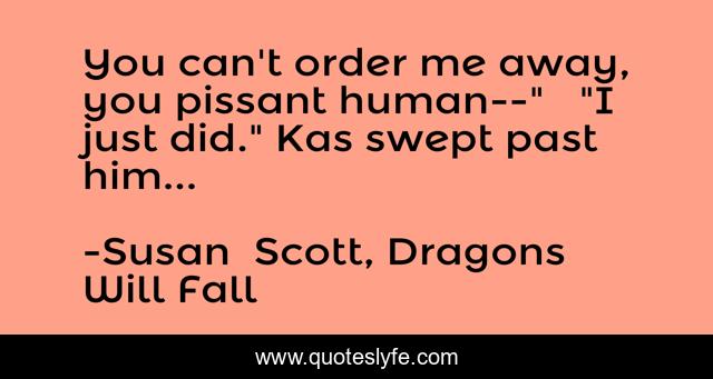 This page presents the quote "You can't order me away, you pissant human--" "I just did." Kas swept past him...". Author of this quote is Susan Scott, Dragons Will Fall. This quote is about romance, fantasy, magic, dragons,.