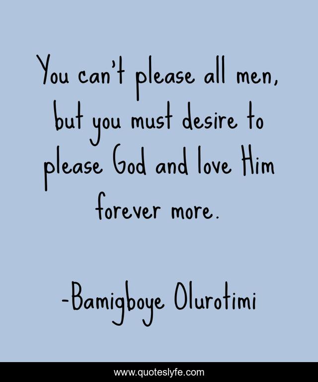 This page presents the quote "You can't please all men, but you must desire to please God and love Him forever more.". Author of this quote is Bamigboye Olurotimi. This quote is about desire, righteousness, faithfulness, omnipotent, holiness, please, choice, please-god, omnipresent,.