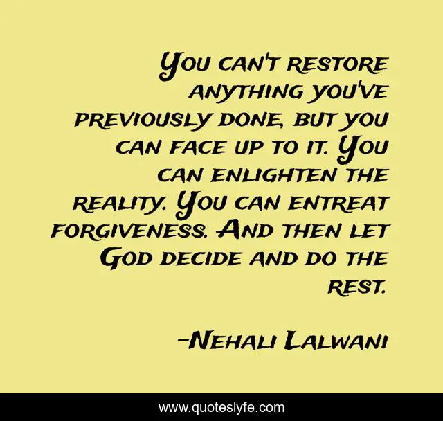 This page presents the quote "You can't restore anything you've previously done, but you can face up to it. You can enlighten the reality. You can entreat forgiveness. And then let God decide and do the rest.". Author of this quote is Nehali Lalwani. This quote is about life, inspirational, reality-of-life, life-lessons, enthusiasm, forgiveness, inspiration,.