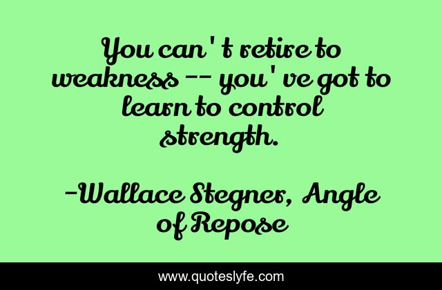 This page presents the quote "You can't retire to weakness -- you've got to learn to control strength.". Author of this quote is Wallace Stegner, Angle of Repose. This quote is about control, weakness, strength, power,.