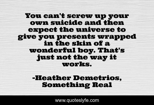 This page presents the quote "You can't screw up your own suicide and then expect the universe to give you presents wrapped in the skin of a wonderful boy. That's just not the way it works.". Author of this quote is Heather Demetrios, Something Real. This quote is about ya, debut-novel, debut-author,.