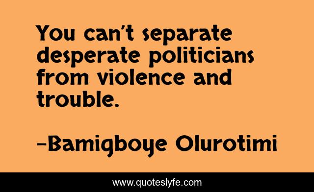 This page presents the quote "You can’t separate desperate politicians from violence and trouble.". Author of this quote is Bamigboye Olurotimi. This quote is about life, violence, deception, desperation, fake-promises, hillary-clinton, lies, politicians, deceit,.