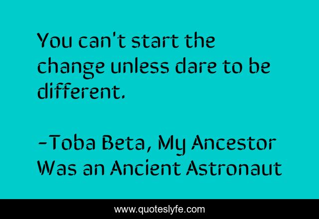 This page presents the quote "You can't start the change unless dare to be different.". Author of this quote is Toba Beta, My Ancestor Was an Ancient Astronaut. This quote is about different, change,.