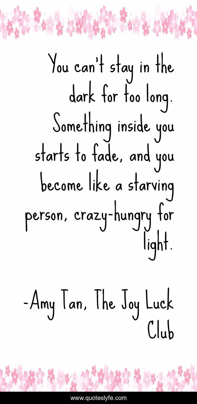 This page presents the quote "You can't stay in the dark for too long. Something inside you starts to fade, and you become like a starving person, crazy-hungry for light.". Author of this quote is Amy Tan, The Joy Luck Club. This quote is about dark, light, desperation,.
