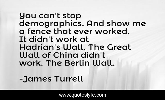 This page presents the quote "You can't stop demographics. And show me a fence that ever worked. It didn't work at Hadrian's Wall. The Great Wall of China didn't work. The Berlin Wall.". Author of this quote is James Turrell. This quote is about me, great,.
