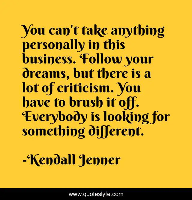 This page presents the quote "You can't take anything personally in this business. Follow your dreams, but there is a lot of criticism. You have to brush it off. Everybody is looking for something different.". Author of this quote is Kendall Jenner. This quote is about your dreams, business,.