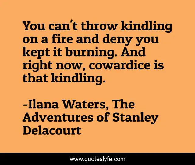 This page presents the quote "You can't throw kindling on a fire and deny you kept it burning. And right now, cowardice is that kindling.". Author of this quote is Ilana Waters, The Adventures of Stanley Delacourt. This quote is about cowardice, bravery,.