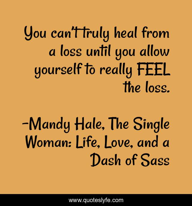 This page presents the quote "You can’t truly heal from a loss until you allow yourself to really FEEL the loss.". Author of this quote is Mandy Hale, The Single Woman: Life, Love, and a Dash of Sass. This quote is about loss, grieving, letting-go, heal, grieve, endings, grief, sadness, heartbreak,.