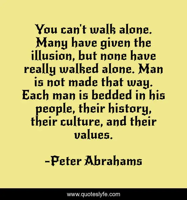 This page presents the quote "You can't walk alone. Many have given the illusion, but none have really walked alone. Man is not made that way. Each man is bedded in his people, their history, their culture, and their values.". Author of this quote is Peter Abrahams. This quote is about alone, culture, man,.