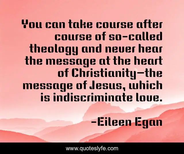 This page presents the quote "You can take course after course of so-called theology and never hear the message at the heart of Christianity—the message of Jesus, which is indiscriminate love.". Author of this quote is Eileen Egan. This quote is about christianity, theology,.