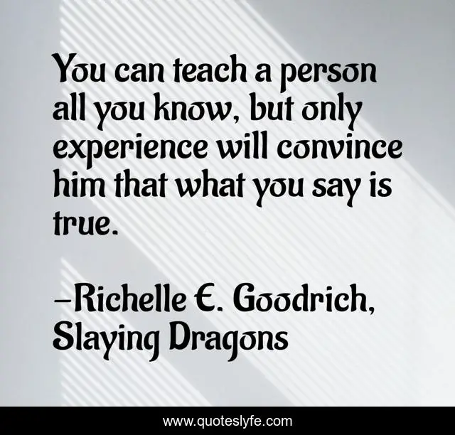 This page presents the quote "You can teach a person all you know, but only experience will convince him that what you say is true.". Author of this quote is Richelle E. Goodrich, Slaying Dragons. This quote is about richelle-e-goodrich, experience, richelle, teachers, richelle-goodrich, consequence, teaching, teach,.