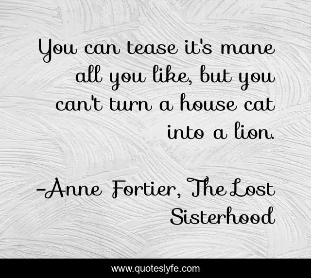 This page presents the quote "You can tease it's mane all you like, but you can't turn a house cat into a lion.". Author of this quote is Anne Fortier, The Lost Sisterhood. This quote is about proverb, lions, bravery,.