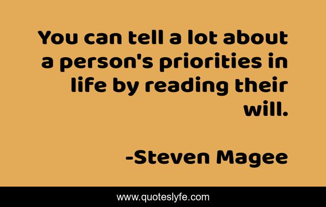 This page presents the quote "You can tell a lot about a person's priorities in life by reading their will.". Author of this quote is Steven Magee. This quote is about life, death, end, person, priorities, priority, their, lot, reading,.
