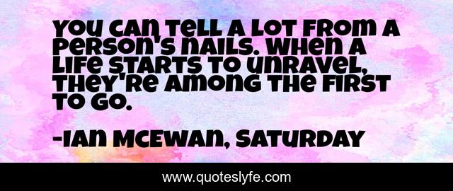 This page presents the quote "You can tell a lot from a person's nails. When a life starts to unravel, they're among the first to go.". Author of this quote is Ian McEwan, Saturday. This quote is about fingernails, nails, despair, depression, manicure,.