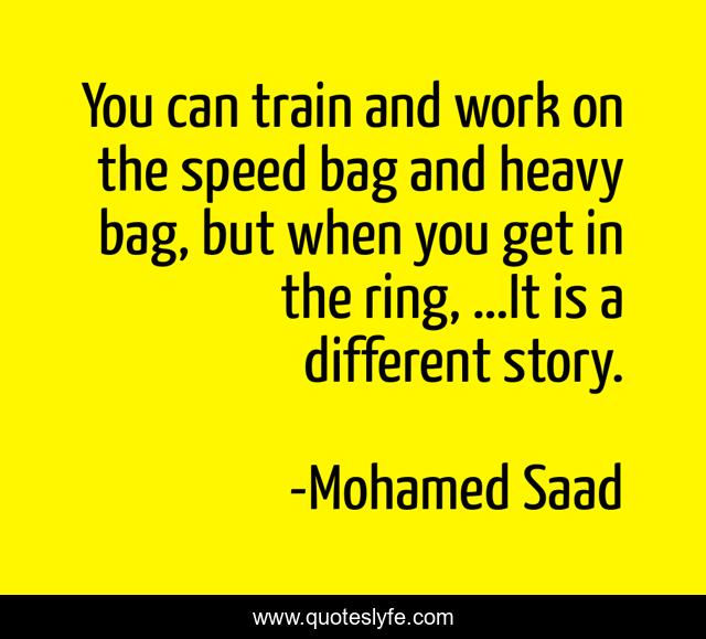 This page presents the quote "You can train and work on the speed bag and heavy bag, but when you get in the ring, …It is a different story.". Author of this quote is Mohamed Saad. This quote is about challenges, work, dream, work-hard, activity,.