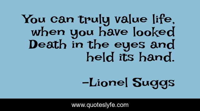 This page presents the quote "You can truly value life, when you have looked Death in the eyes and held its hand.". Author of this quote is Lionel Suggs. This quote is about life-philosophy, death, values-in-life,.
