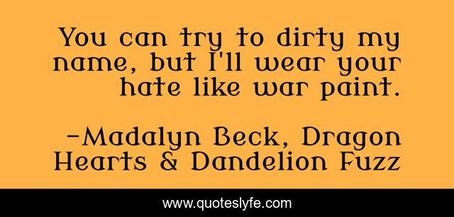 This page presents the quote "You can try to dirty my name, but I'll wear your hate like war paint.". Author of this quote is Madalyn Beck, Dragon Hearts & Dandelion Fuzz. This quote is about strength, behaviour, attitude, inspirational, rise-above, war-paint, enthusiasm,.