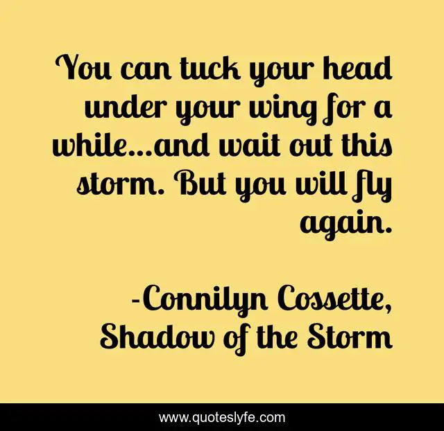 This page presents the quote "You can tuck your head under your wing for a while...and wait out this storm. But you will fly again.". Author of this quote is Connilyn Cossette, Shadow of the Storm. This quote is about thriving, wait, healing, inspirational, enthusiasm,.