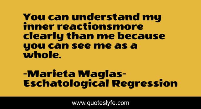 This page presents the quote "You can understand my inner reactionsmore clearly than me because you can see me as a whole.". Author of this quote is Marieta Maglas- Eschatological Regression. This quote is about understand, reaction, whole, inner, reactions,.