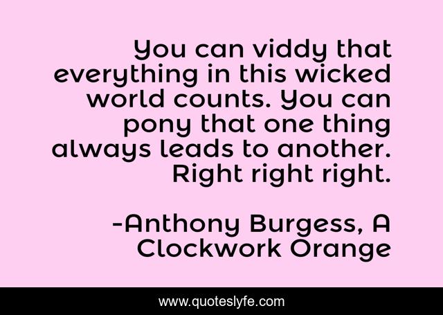 This page presents the quote "You can viddy that everything in this wicked world counts. You can pony that one thing always leads to another. Right right right.". Author of this quote is Anthony Burgess, A Clockwork Orange. This quote is about a-clockwork-orange, book, books, anthony-burgess,.