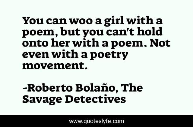 This page presents the quote "You can woo a girl with a poem, but you can't hold onto her with a poem. Not even with a poetry movement.". Author of this quote is Roberto Bolaño, The Savage Detectives. .