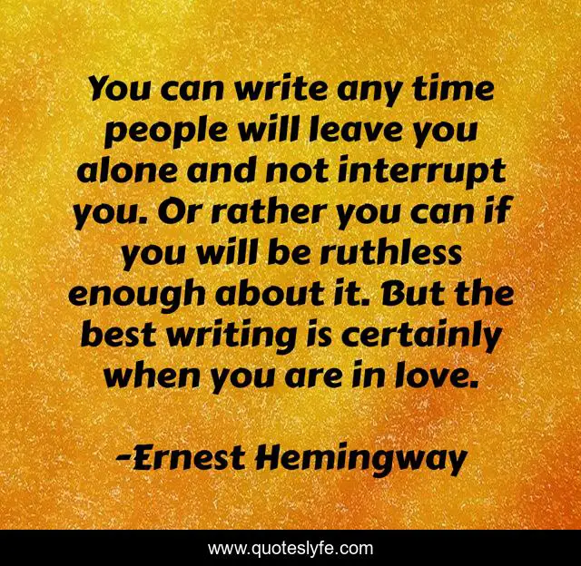This page presents the quote "You can write any time people will leave you alone and not interrupt you. Or rather you can if you will be ruthless enough about it. But the best writing is certainly when you are in love.". Author of this quote is Ernest Hemingway. .