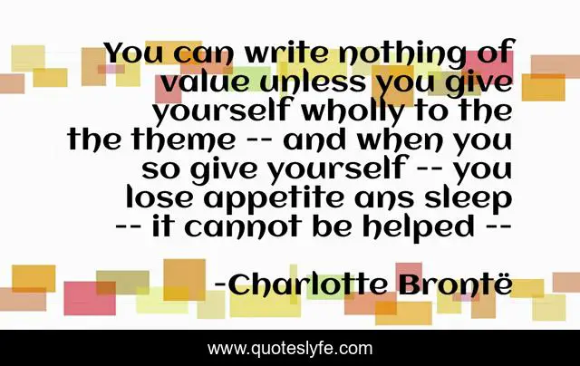 This page presents the quote "You can write nothing of value unless you give yourself wholly to the the theme -- and when you so give yourself -- you lose appetite ans sleep -- it cannot be helped --". Author of this quote is Charlotte Brontë. This quote is about writer, writing,.