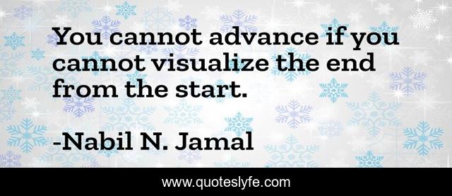 This page presents the quote "You cannot advance if you cannot visualize the end from the start.". Author of this quote is Nabil N. Jamal. This quote is about advance, visualize, end, nabil, start, cannot, nabil-jamal, nabil-n-jamal, jamal,.