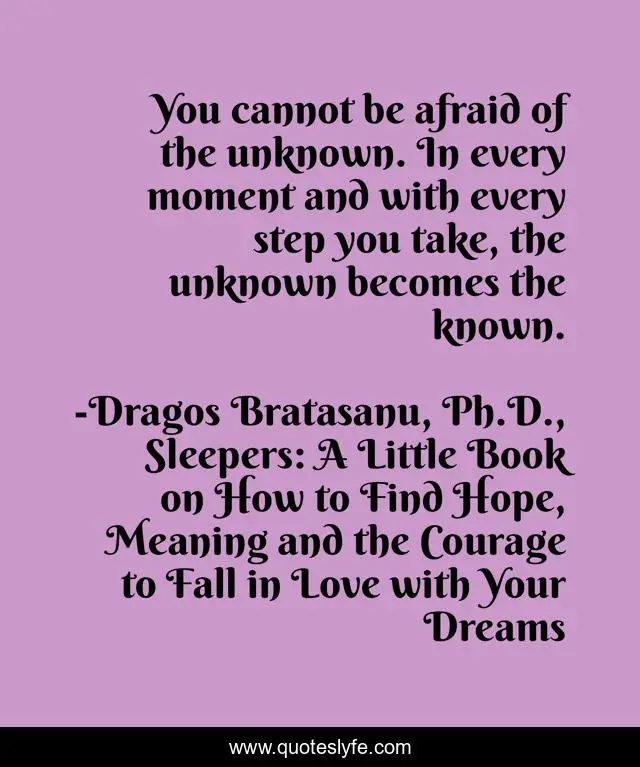 "Dragos Bratasanu, Ph.D., Sleepers: A Little Book on How to Find Hope, Meaning and the Courage to Fall in Love with Your Dreams Quotes." Quoteslyfe.com, 2025. Sun. 14 Dec. 2025. <https://www.quoteslyfe.com/quote/You-cannot-be-afraid-of-the-unknown-45393>.