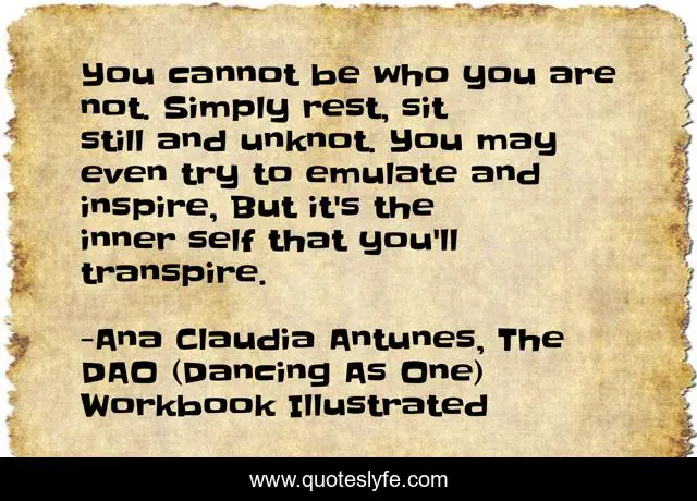 This page presents the quote "You cannot be who you are not. Simply rest, sit still and unknot. You may even try to emulate and inspire, But it's the inner self that you'll transpire.". Author of this quote is Ana Claudia Antunes, The DAO (Dancing As One) Workbook Illustrated. This quote is about truthfulness, inspire, yoga-practice, emulate, inner-self, sitting, being-yourself, true-self, meditate,.