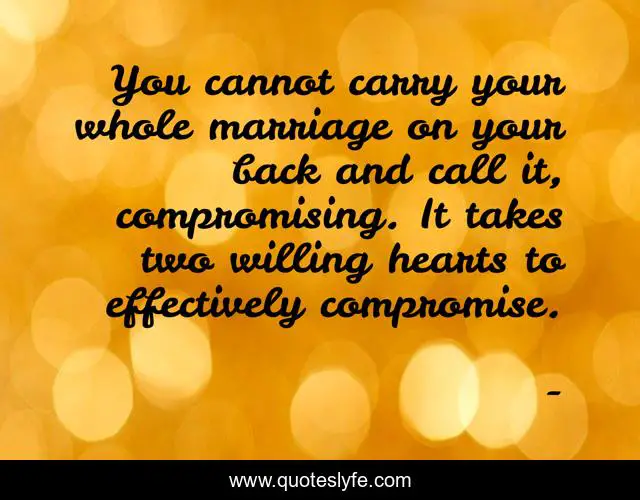This page presents the quote "You cannot carry your whole marriage on your back and call it, compromising. It takes two willing hearts to effectively compromise.". Author of this quote is . This quote is about compromising, edmond-mbiaka, responsibilities, compromise, marriage, two-willing-hearts,.