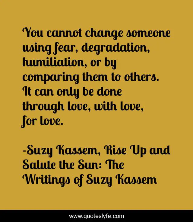 This page presents the quote "You cannot change someone using fear, degradation, humiliation, or by comparing them to others. It can only be done through love, with love, for love.". Author of this quote is Suzy Kassem, Rise Up and Salute the Sun: The Writings of Suzy Kassem. This quote is about comparison, love, humiliation, degradation, degrading, teaching, fear, education, hate,.