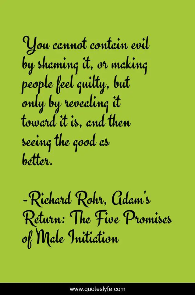 This page presents the quote "You cannot contain evil by shaming it, or making people feel guilty, but only by revealing it toward it is, and then seeing the good as better.". Author of this quote is Richard Rohr, Adam's Return: The Five Promises of Male Initiation. This quote is about counseling, discipleship, sanctification,.