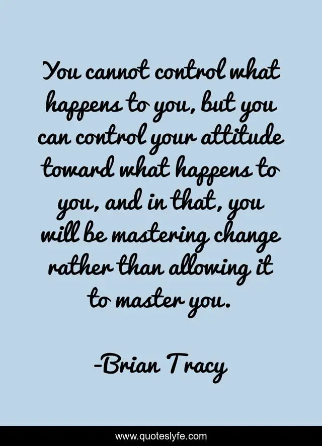 This page presents the quote "You cannot control what happens to you, but you can control your attitude toward what happens to you, and in that, you will be mastering change rather than allowing it to master you.". Author of this quote is Brian Tracy. This quote is about life, wisdom,.