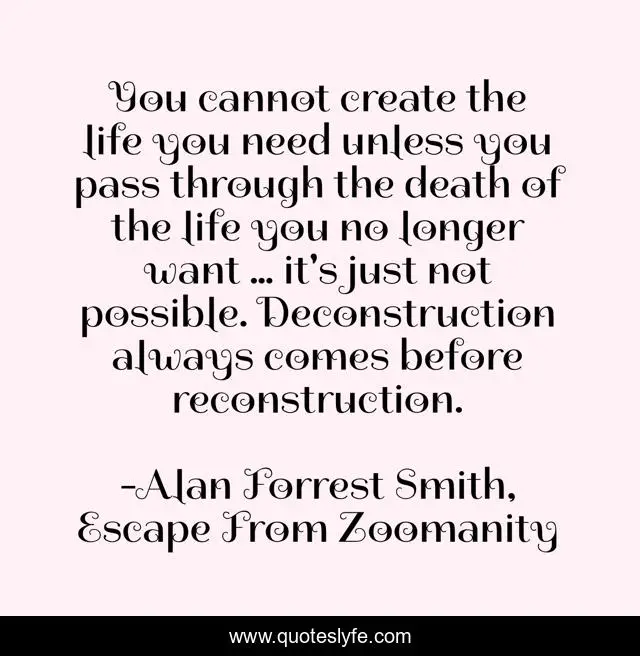 This page presents the quote "You cannot create the life you need unless you pass through the death of the life you no longer want … it's just not possible. Deconstruction always comes before reconstruction.". Author of this quote is Alan Forrest Smith, Escape From Zoomanity. This quote is about enthusiasm, philosophical, inspirational,.