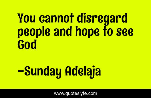 This page presents the quote "You cannot disregard people and hope to see God". Author of this quote is Sunday Adelaja. This quote is about kingdom, life, love, destiny, serving-god, people, money, god, work,.