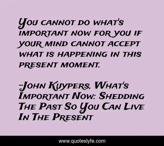 This page presents the quote "You cannot do what's important now for you if your mind cannot accept what is happening in this present moment.". Author of this quote is John Kuypers, What's Important Now: Shedding The Past So You Can Live In The Present. This quote is about enthusiasm, present-moment, happiness, inspirational, self-improvement,.