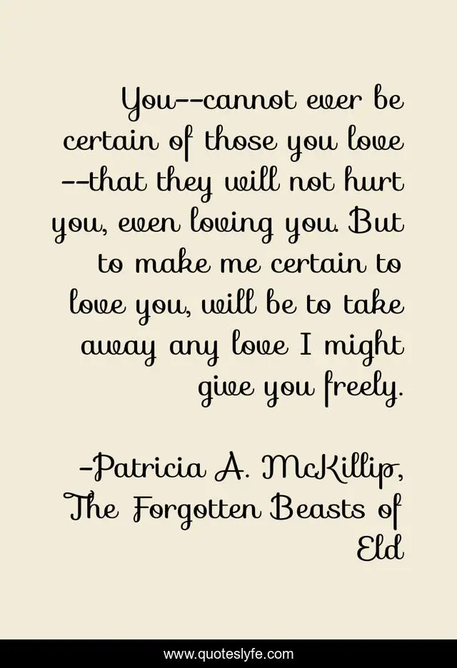 This page presents the quote "You--cannot ever be certain of those you love--that they will not hurt you, even loving you. But to make me certain to love you, will be to take away any love I might give you freely.". Author of this quote is Patricia A. McKillip, The Forgotten Beasts of Eld. This quote is about freedom, freedom-to-love, love, affection,.