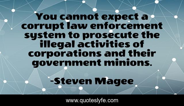 This page presents the quote "You cannot expect a corrupt law enforcement system to prosecute the illegal activities of corporations and their government minions.". Author of this quote is Steven Magee. This quote is about activities, prosecute, government, illegal, system, cannot, minions, expect, corrupt,.