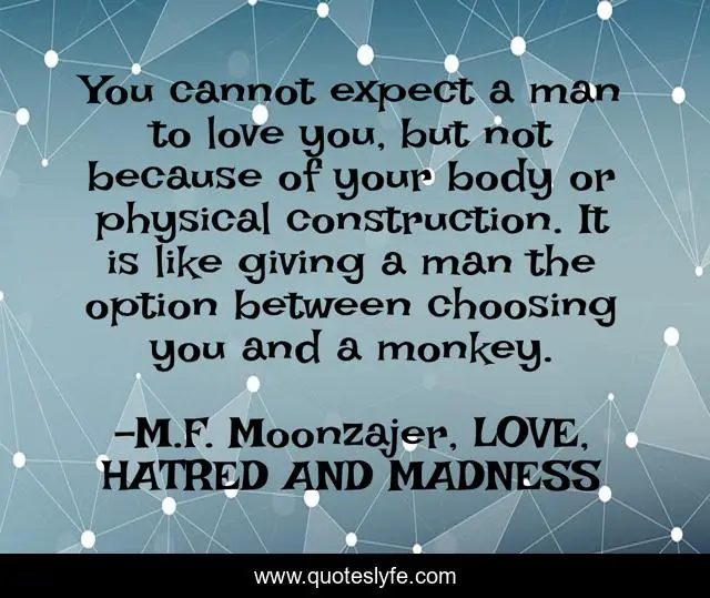 This page presents the quote "You cannot expect a man to love you, but not because of your body or physical construction. It is like giving a man the option between choosing you and a monkey.". Author of this quote is M.F. Moonzajer, LOVE, HATRED AND MADNESS. This quote is about body, funny, woman, love, monkey, girls, construction, expect, man,.