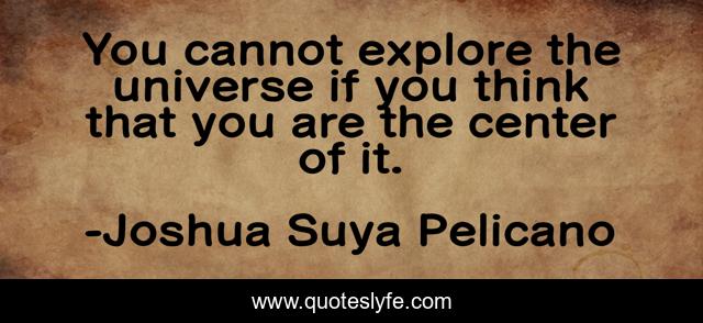 This page presents the quote "You cannot explore the universe if you think that you are the center of it.". Author of this quote is Joshua Suya Pelicano. This quote is about knowlegde, science, explore, wisdom, universe,.