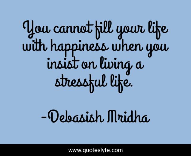 This page presents the quote "You cannot fill your life with happiness when you insist on living a stressful life.". Author of this quote is Debasish Mridha. This quote is about philosophy, debasish-mridha, living-a-stressful-life, quotes, inspirational, enthusiasm, debasish-mridha-m-d, happiness,.
