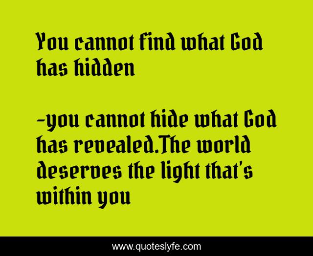 "you cannot hide what God has revealed.The world deserves the light that’s within you Quotes." Quoteslyfe.com, 2025. Fri. 05 Dec. 2025. <https://www.quoteslyfe.com/quote/You-cannot-find-what-God-has-hidden-98323>.
